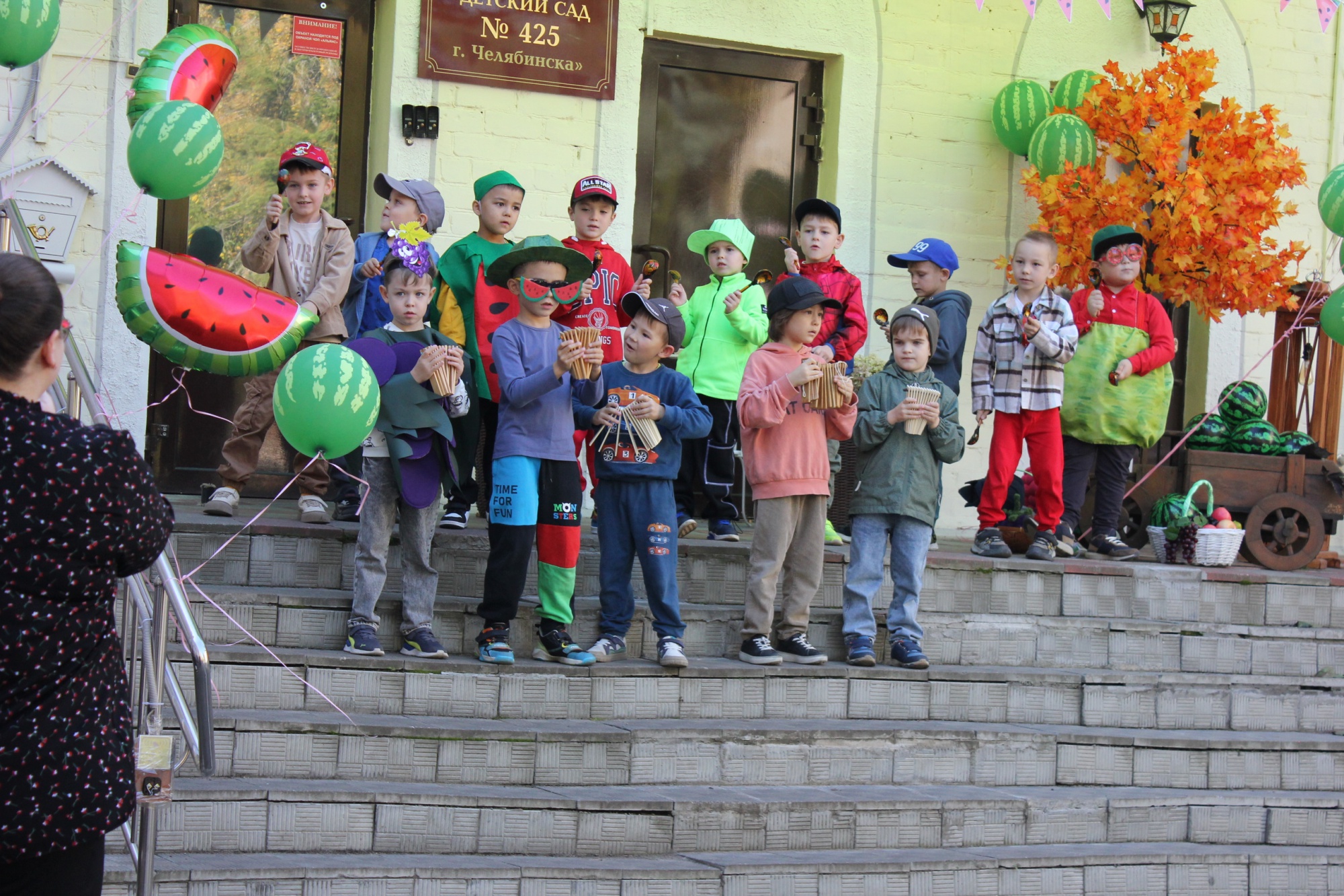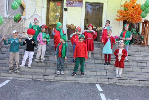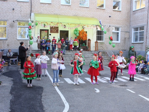 Площадка возле главного входа превратилась в настоящий осенний лес! С разноцветными листочками (кленовыми, дубовыми, березовыми) ребята устроили яркий флешмоб. А позже в гости к ним заглянула садовница Варвара с огромной корзиной, в которой лежал главный герой праздника - АРБУЗ!